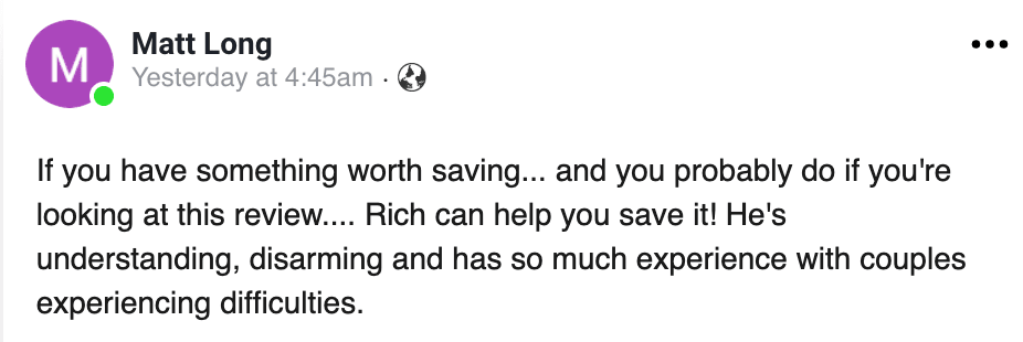 Rich Heller is the founder Rich in Relationship. He's helped hundreds of frustrated husbands all over the US to rebuild their marriages and become the best fathers they could be.